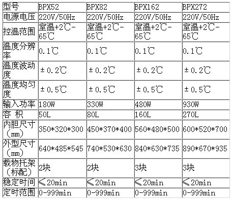 | BPX272電熱恒溫培養(yǎng)箱 | 270L | 1 | 10320元 | 內(nèi)膽尺寸(mm)600*520*700外型尺寸(mm)890*670*935 |