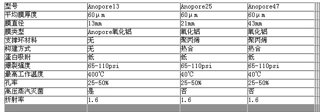 此膜是高純度氧化鋁基質(zhì)通過電化學(xué)制成。蛋白吸附力低、自身熒光非常小、無毒、支持細(xì)胞生長。Anopore有三種孔徑:0.02μm、0.1μm和0.2μm;和三種直徑:13mm、25mm和47mm。